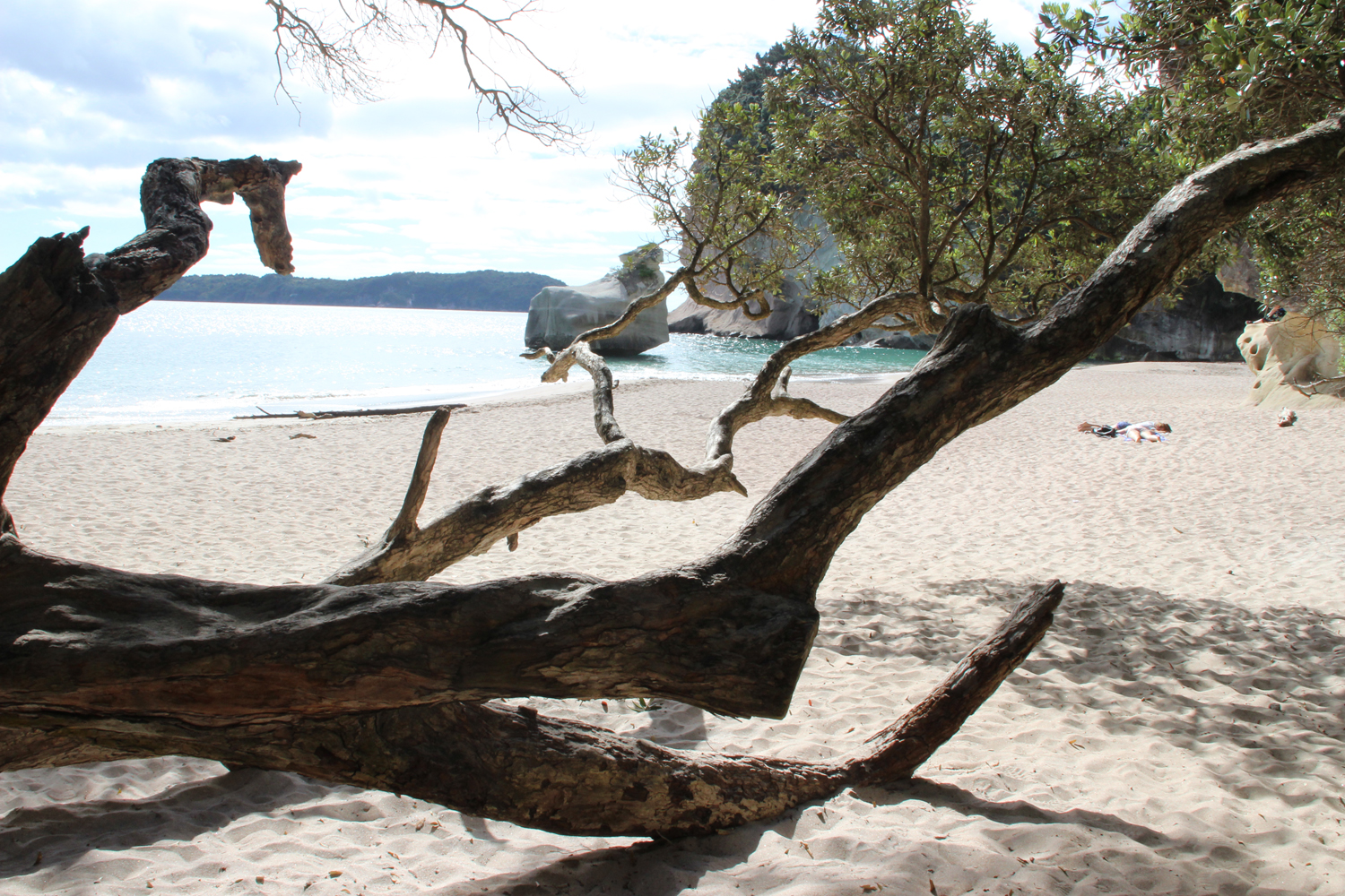 Zu den letzten Stationen gehörte ein Besuch der Cathedral Cove in Coromandel. Die verträumte Bucht mit der meterhohen Cove, dem feinen Sand und den abseits vom Strand im Wasser stehenden Felsbrocken ist einer dieser Orte, wie man sie sich schöner nicht hätte vorstellen können. Ich hatte großes Glück und das Wetter war fantastisch. Außerdem war ich so früh da, dass erst als ich mich wieder auf den Rückweg machte, viele weitere Touristengrüppchen ihren Weg hinab zum Strand fanden oder mit Kajaks dort über den Wasserweg landeten.