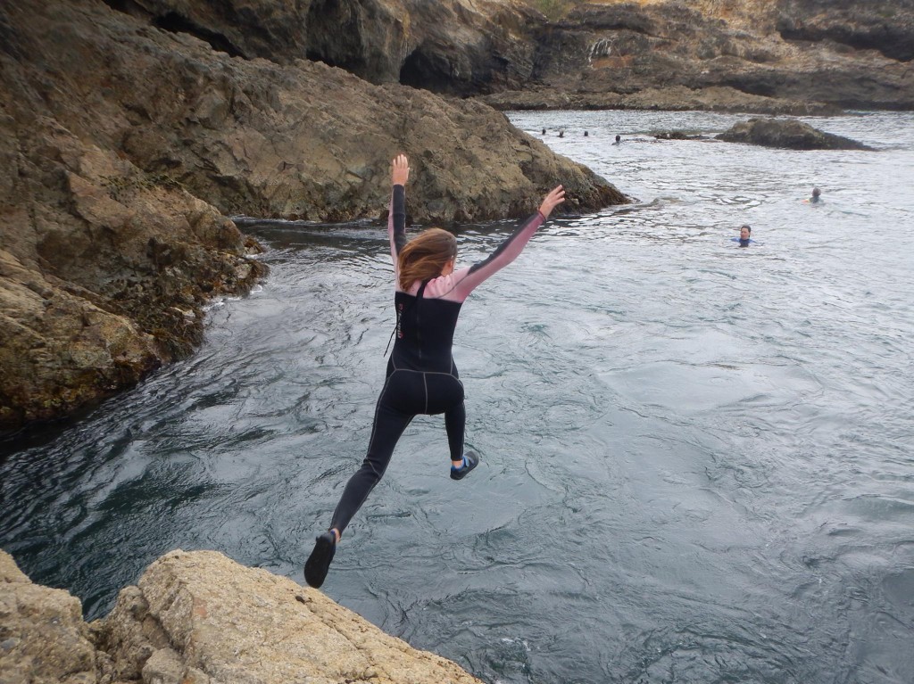 Wir fuhren etwa 20 Minuten, bis wir einen Strand erreicht hatten, der nach links und rechts in eine felsige Küstenlandschaft auslief. In unseren Anzügen – ich war froh, dass kein Spiegel zur Hand war, denn mein Gott, muss ich albern ausgesehen haben 😀 – begannen wir, über die felsige Küste zu klettern, entdeckten Seesterne, probierten Austern und fanden lustige Muscheln. Richtig spannend wurde es dann, als wir endlich von einem Felsen aus ins Wasser springen durften. Vor uns im Fels klafften zwei Höhlen auf, die schlauchartig verbunden waren. Drinnen war es recht düster, wilde Wellen schubsten uns hin und her und jede hereinrollende Welle erforderte das hastige und kräftige Festhalten am nächstgelegenen Stein. Was hier vielleicht für den ein oder anderen etwas unbehaglich klingt, war ein riesen Spaß! Bernice wusste zu jeder Sekunde genau, was sie tat und hatte ein Auge auf die Schüler, denen die Wellen etwas ungeheuer waren.